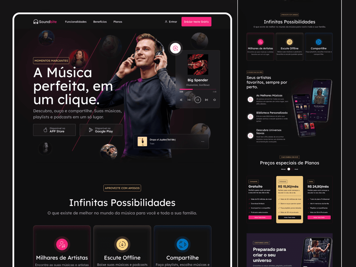 Landing page de lançamento para um aplicativo de músicas e podcasts, aplicando heurísticas de Nielsen e vieses cognitivos para criar uma experiência focada em conversão.