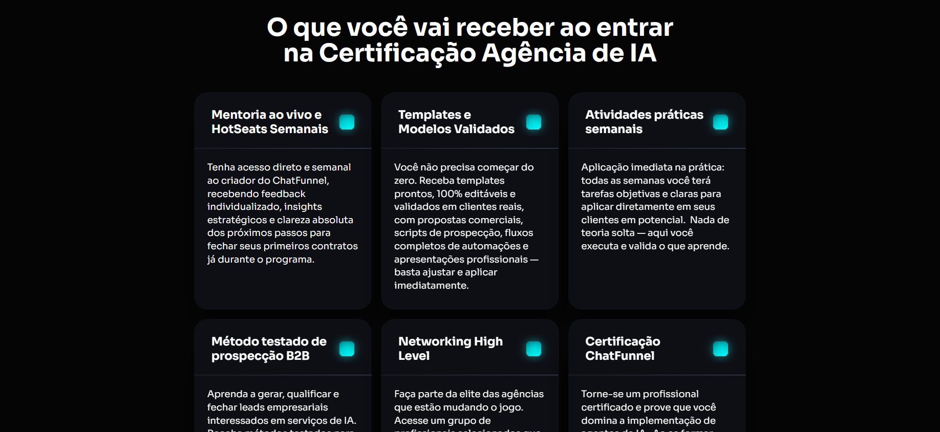 O que você vai receber — mentoria ao vivo, templates, atividades práticas, prospecção B2B, networking e certificação