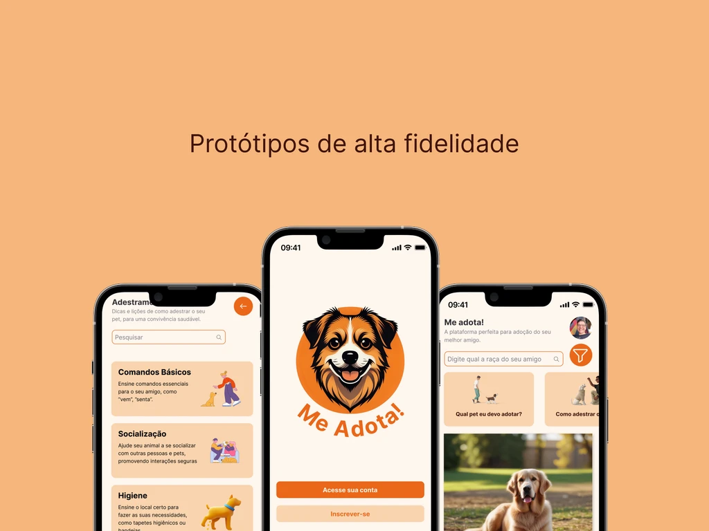 O Me Adota! é um aplicativo para facilitar o processo de adoção de animais, desenvolvido como projeto de estudo durante minha formação em UI Design. O projeto exercitou o fluxo completo de design: desde a criação do design system e style guide até wireframes e protótipos de alta fidelidade no Figma, com componentes ajustáveis e padronizados.