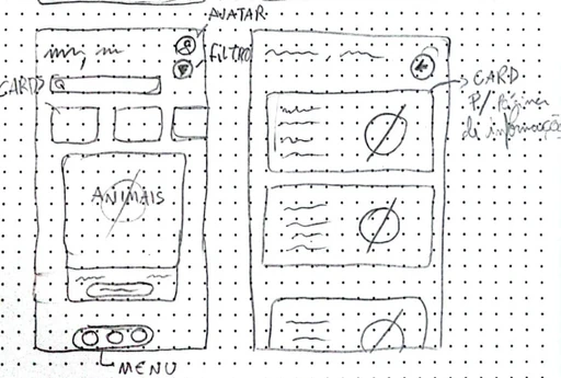 Wireframes iniciais — rascunhos no papel para validação dos fluxos e estrutura das telas