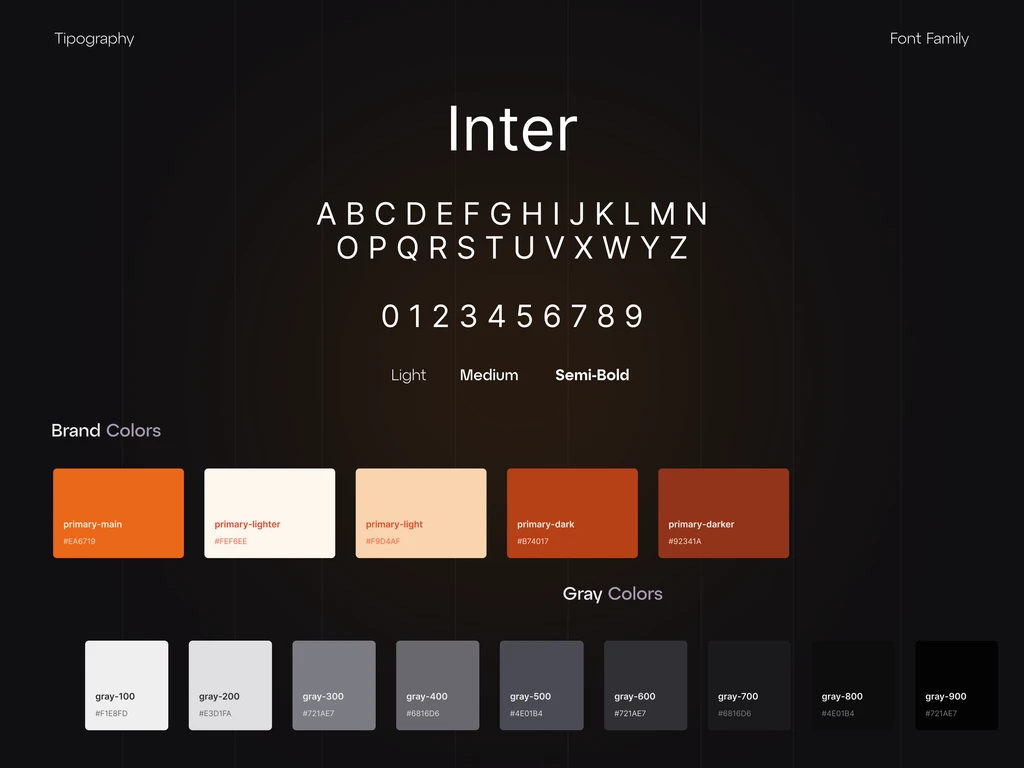 Style guide — tipografia Inter e paleta de cores com tons laranja (#EA6719) e cinza