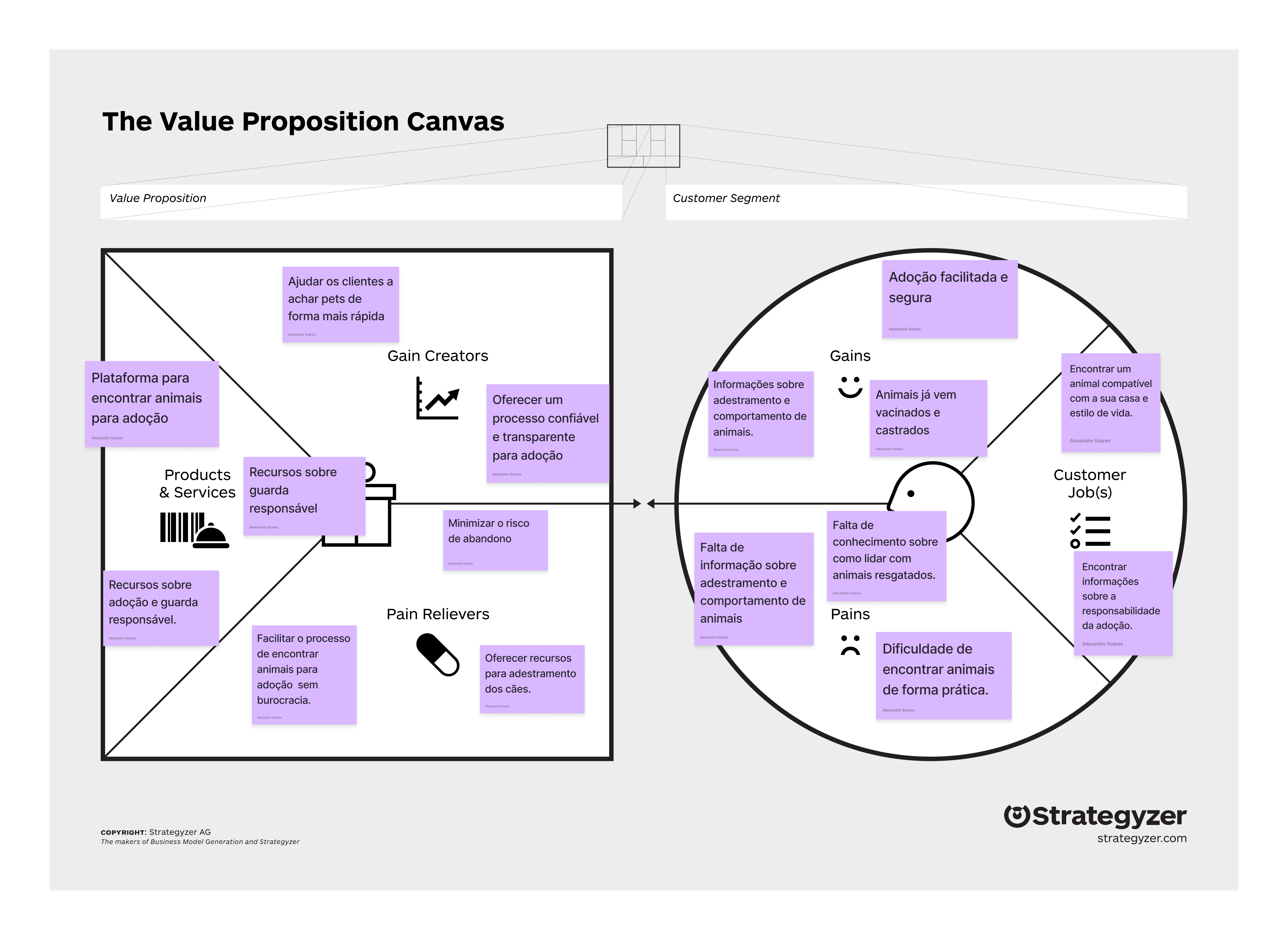 Value Proposition Canvas — proposta de valor mapeada em relação às dores e ganhos dos usuários