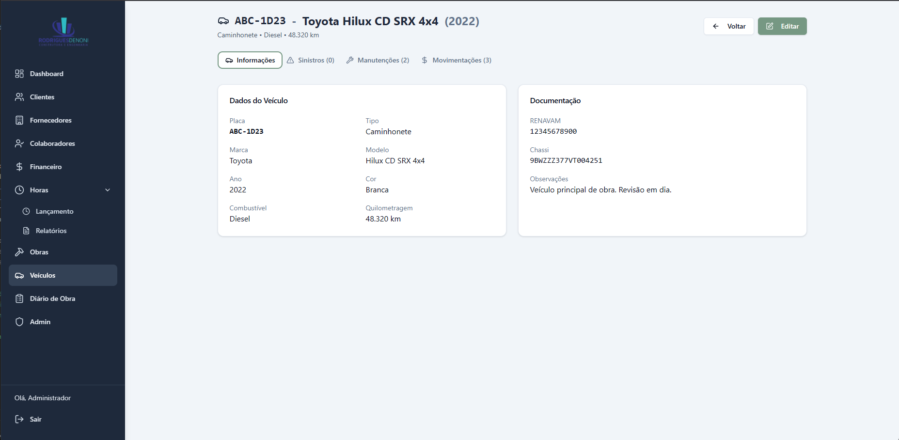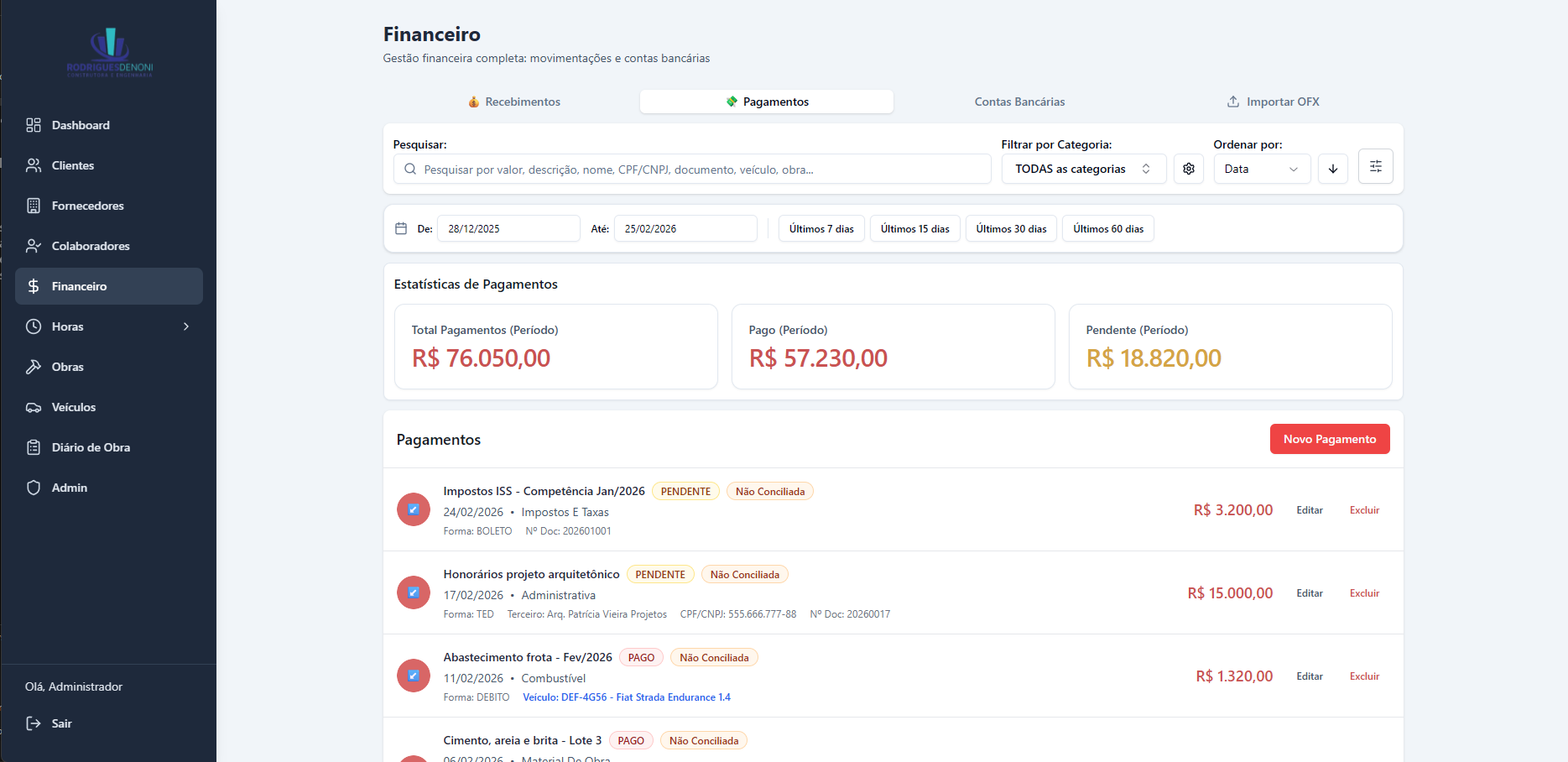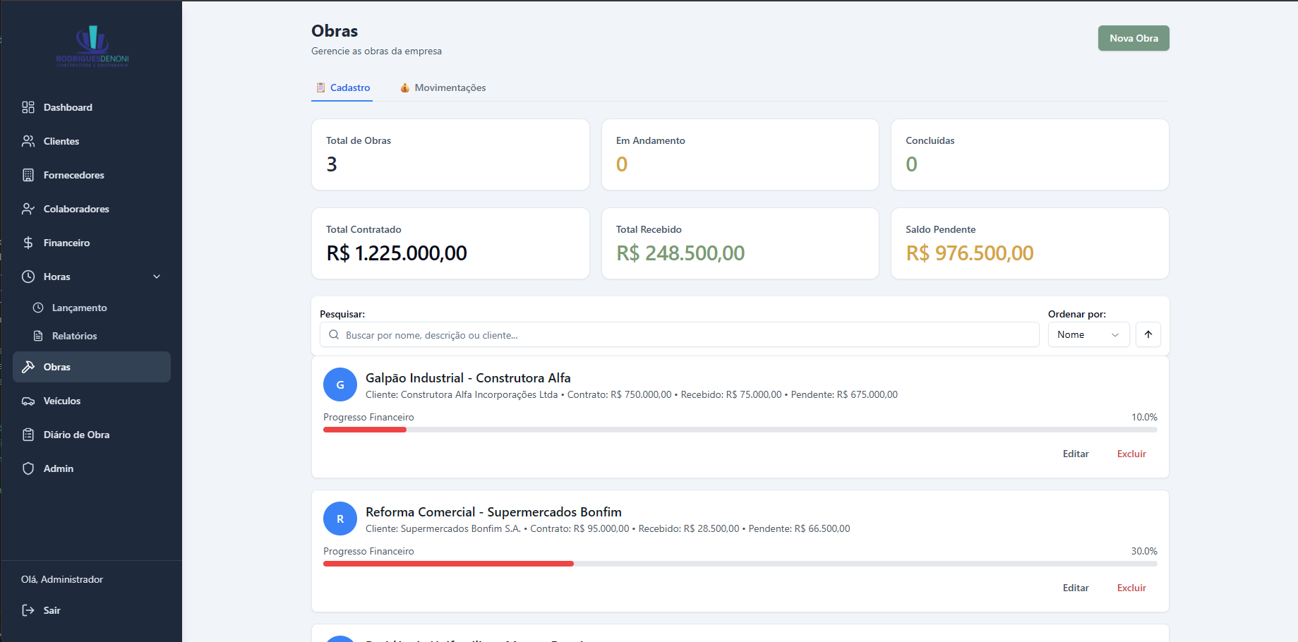 O ERP Rodrigues Denoni Engenharia foi desenvolvido para digitalizar e centralizar toda a operação de um escritório de engenharia civil — da gestão financeira ao acompanhamento de obras em campo. O sistema cobre desde o cadastro de clientes, fornecedores e colaboradores até o controle de contratos, ordens de serviço, manutenção de frota e folha de pagamento, substituindo processos manuais fragmentados por uma plataforma integrada acessível em qualquer dispositivo.