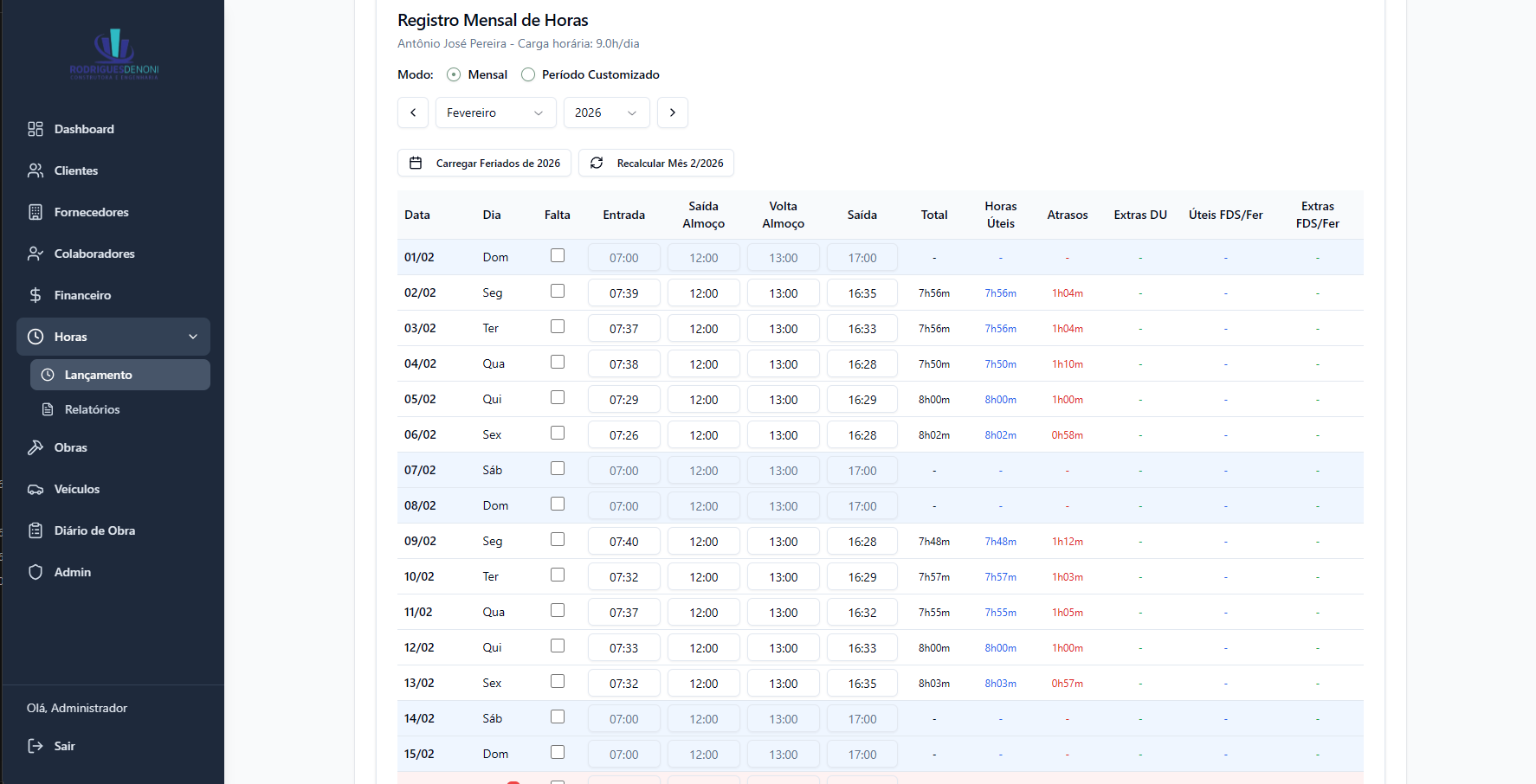 O escritório operava com planilhas dispersas, comunicação informal e sem nenhuma visibilidade centralizada sobre o que acontecia em campo ou nas finanças. Engenheiros registravam o andamento das obras em cadernos, o controle de horas dos colaboradores era feito manualmente, os extratos bancários precisavam ser conciliados na mão e os clientes não tinham nenhuma forma de acompanhar o status de suas obras. Cada área funcionava de forma isolada, gerando retrabalho, inconsistências e dificuldade de tomada de decisão.