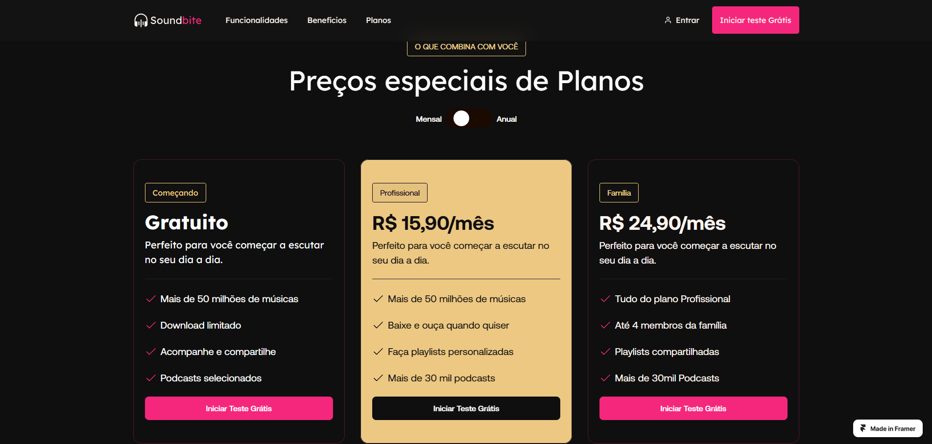 O Soundbite é um projeto de estudo onde apliquei princípios de UI Design e UX Design, como as heurísticas de Nielsen e vieses cognitivos, para criar uma landing page de lançamento para um aplicativo fictício de músicas e podcasts. O projeto foi desenvolvido sob orientação do professor Kácio, unindo Figma e Framer em um fluxo completo de design e implementação.