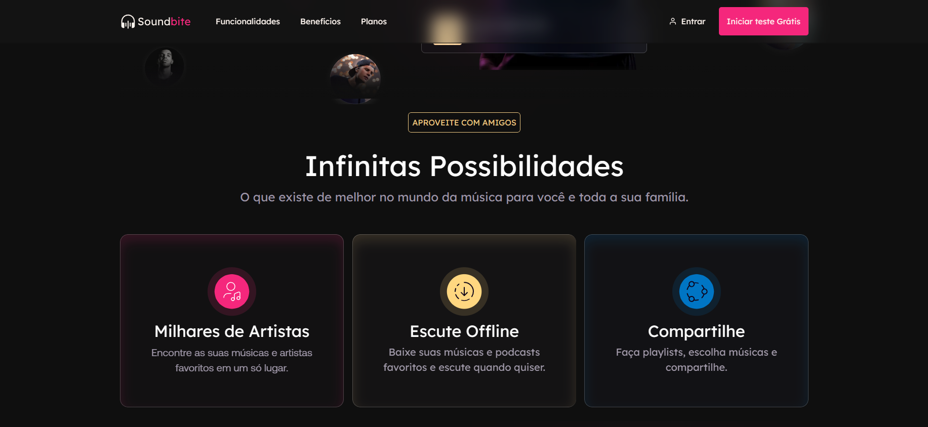 Criar uma landing page que apresentasse as features, benefícios e planos de um aplicativo de entretenimento musical. A página precisava ser clara, responsiva e focada em conversão para downloads, comunicando a proposta de valor do app de forma envolvente.
